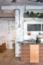 Un large bar, dessiné par OURO et fabriqué par Atelier Variable, détourne des éléments de construction primaire pour créer une pièce particulière. Elle requalifie le lieu tout en faisant écho à ce local très brut. De la nourriture élémentaire dans un lieu presque encore en chantier !